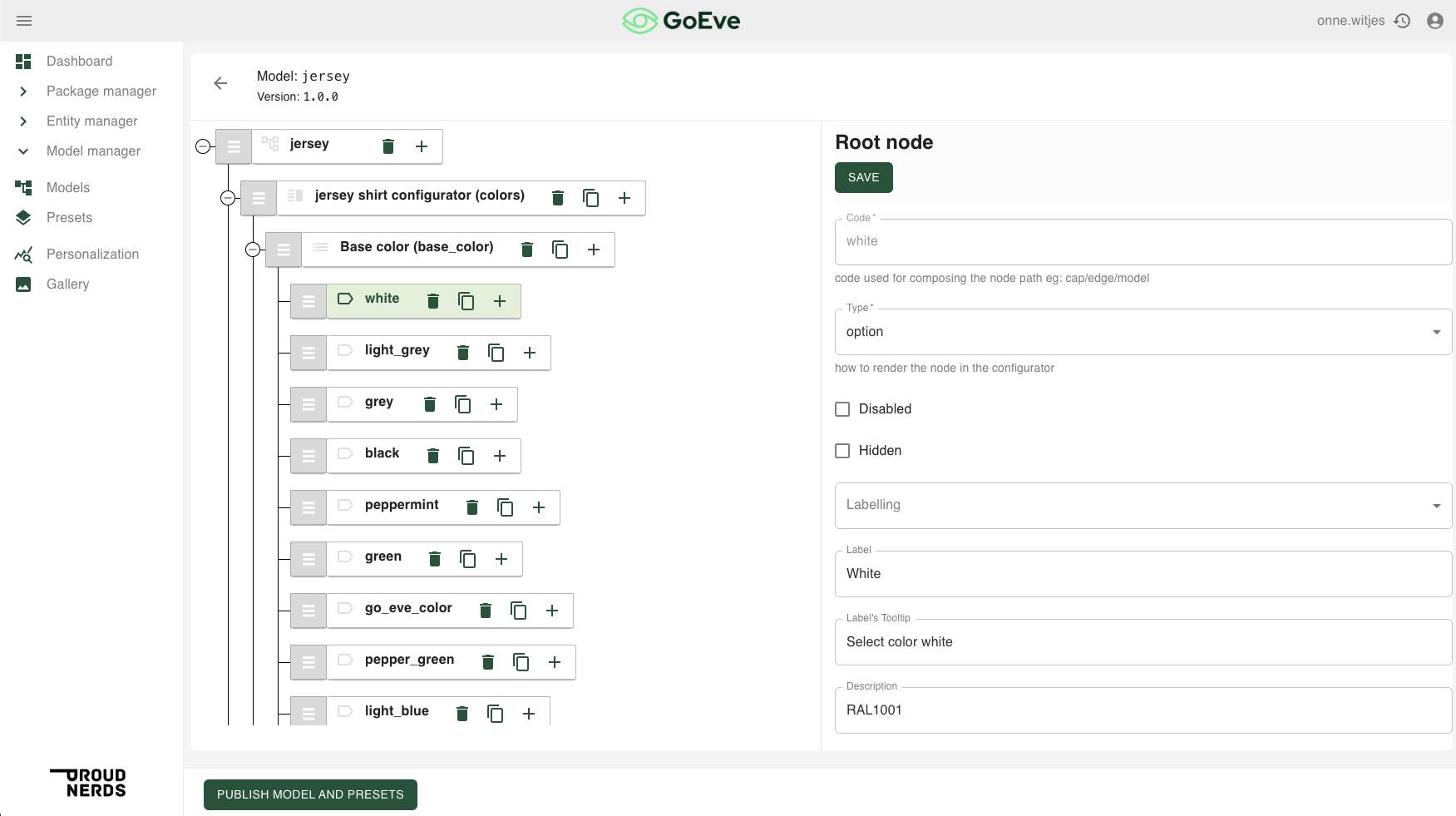 De Model Manager vormt de ruggengraat van de productconfigurator en maakt het mogelijk om modellen te maken, bewerken, verwijderen, importeren en exporteren. Elk model is gestructureerd als een genest JSON-bestand met gegevenspunten (nodes), waardoor een gedetailleerde en georganiseerde configuratiestructuur ontstaat die overdraagbaar is naar externe systemen. Deze opzet ondersteunt onder andere:
