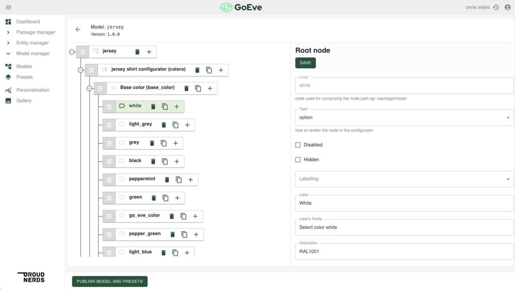 The Model Manager forms the backbone of the product configurator and allows you to create, edit, delete, import and export models. Each model is structured as a nested JSON file with data points (nodes), providing a detailed and organized configuration structure that is transferable to external systems. This setup supports, among other things: